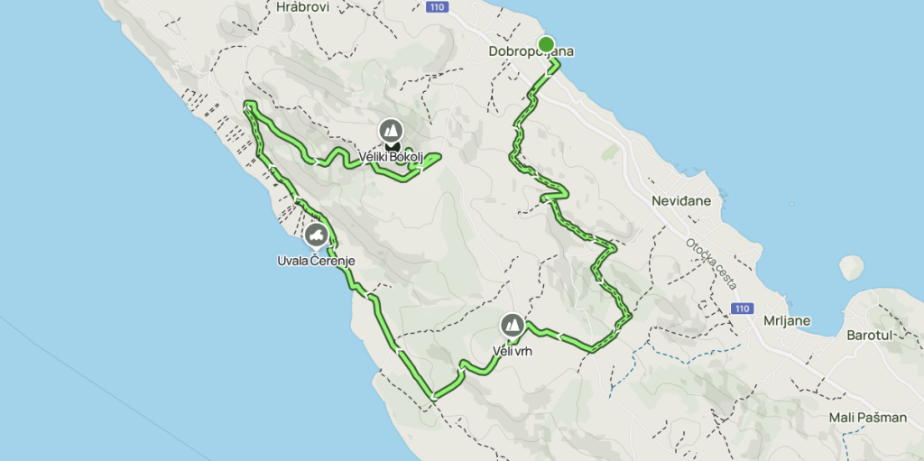 Staza prolazi centrom mjesta odakle nastavlja uzbrdo među maslinike, odakle se spušta u blizinu Neviđana do okrepne/kontrolne točke gdje se spaja sa stazom Blue (8 km). Od tu počinje uspon do vršnog dijela otoka. Nakon uspona je spust do južnih obala Pašmana. Sa južne strane počinje opet uspon prema cilju na kojem se nalazi oko 500 m singletracka i dalje nastavlja uspon makadamom prema cilju koji se nalazi na vrhu Veliki Bokolj na 274 m/nv je s kojeg se pruža pogled 360 stupnjeva na Velebit